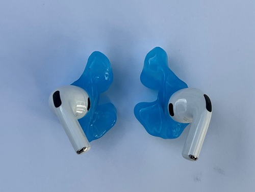 Apple AirPod Pro "3" with Light Blue custom earpieces. Note: AirPods may need to be turned on and off manually from your iPhone and the "automatic ear detection" setting disabled due to the sensors being covered by our earpieces that detect if they are in your ears. Earpieces will need to be removed to fit in charging case.